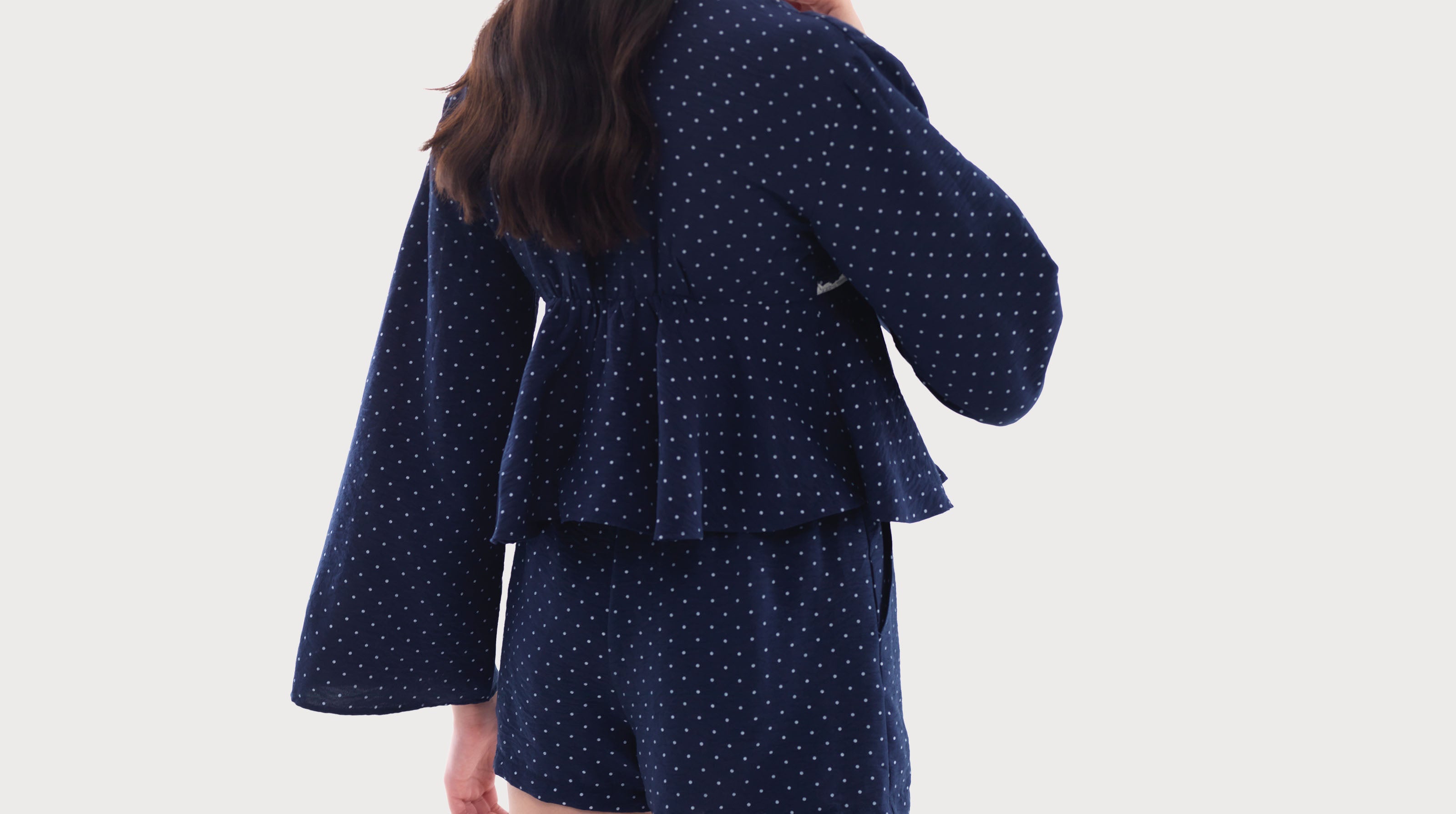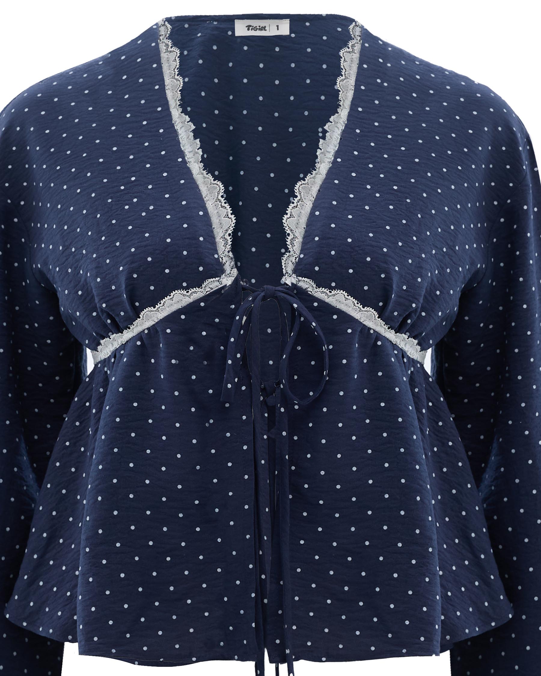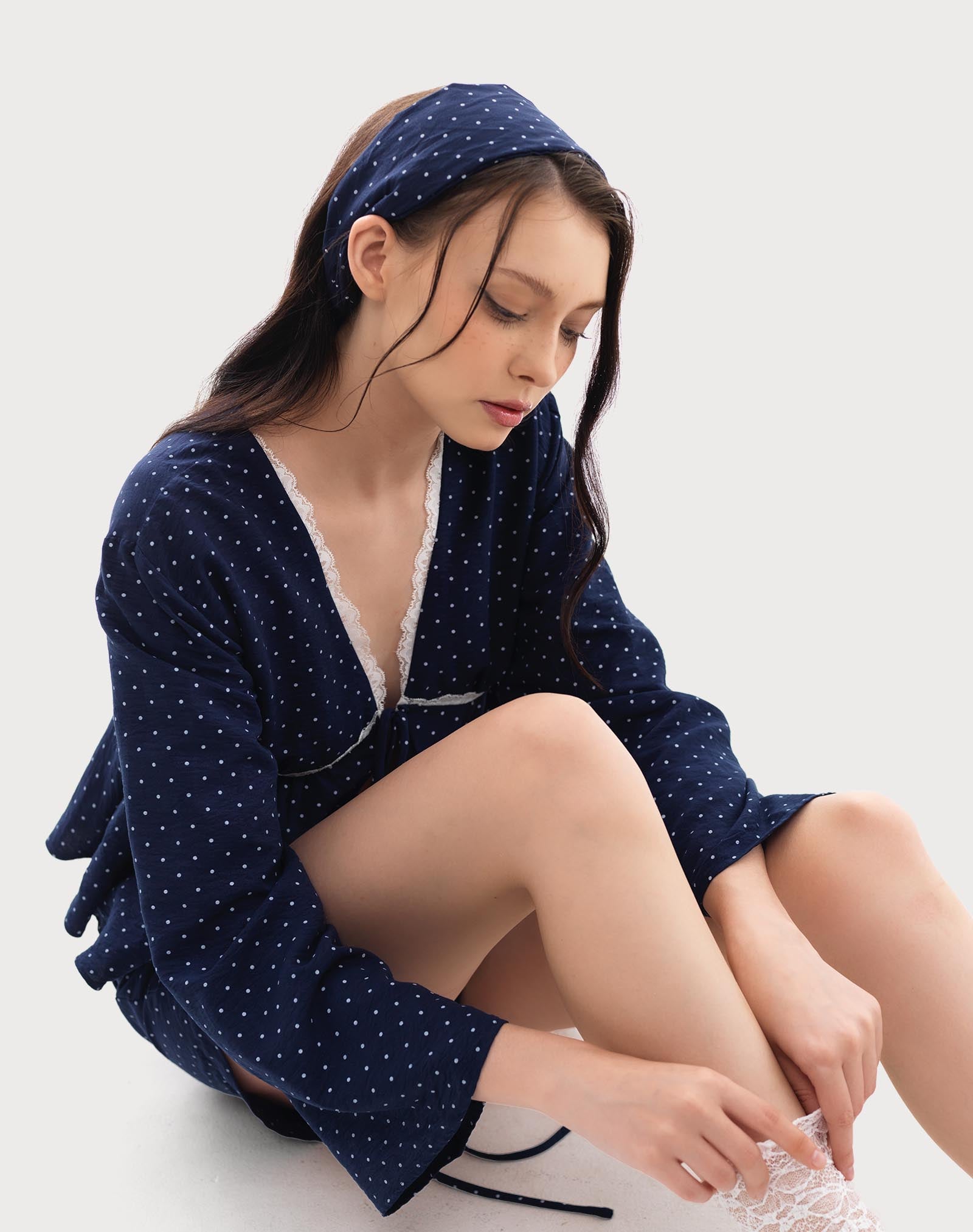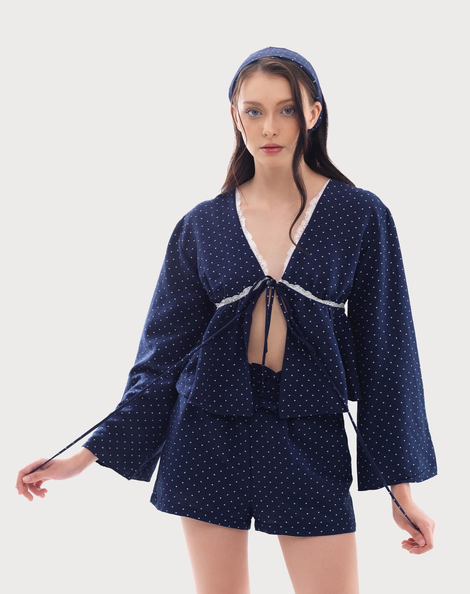Set 2 mảnh gồm áo tay dài buộc dây và quần short cạp chun.Viền ren mảnh được phối tinh tế nhằm tạo điểm nhấn nữ tính mà không rườm rà.