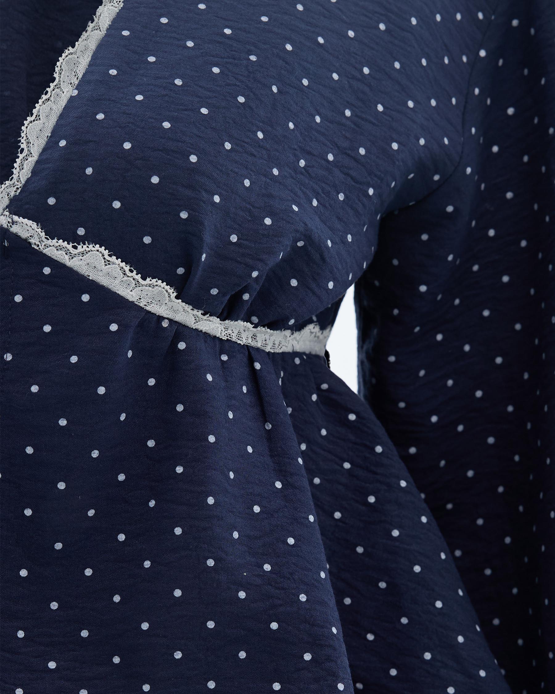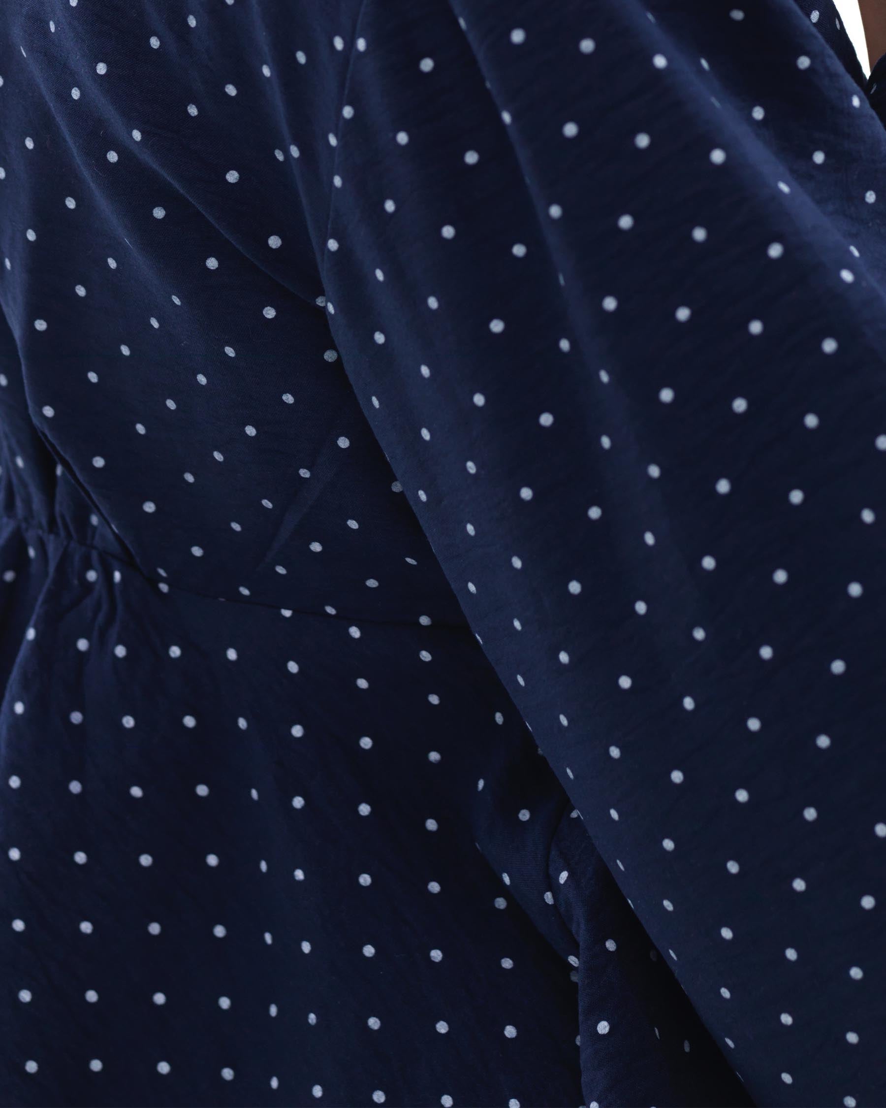 • Chất vải: Xô xốp cotton in họa tiết chấm bi – chất liệu mềm nhẹ, thoáng khí, có texture gợn tự nhiên tạo độ bay nhẹ.