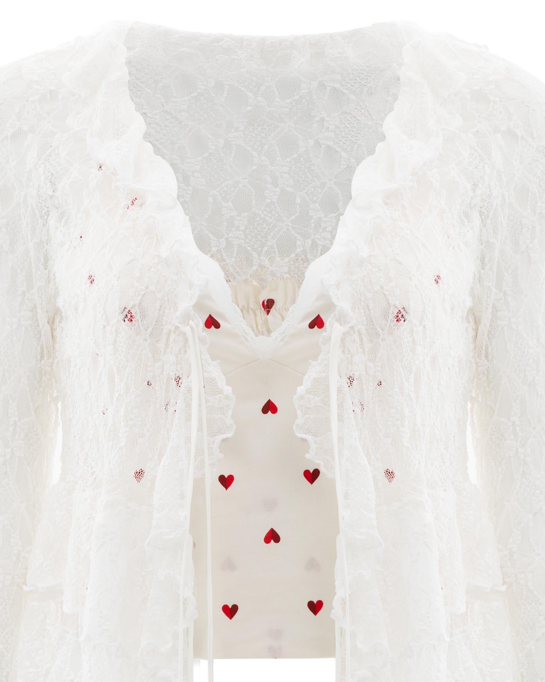 Set 2 mảnh gồm áo tay dài buộc dây và quần short cạp chun.Viền ren mảnh được phối tinh tế nhằm tạo điểm nhấn nữ tính mà không rườm.